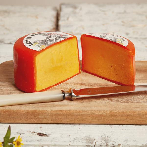 Rolling Cheese Lady in Red 200g. A strong yet crumbly Red Leicester cheese. Produced by artisanal cheese maker Anthony Rowcliffe, who's recipes have passed from one generation to the next.